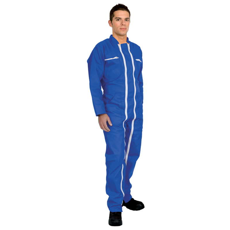 Matières : 65% polyester 35% coton 245 g/m² ou 100% coton 320 g/m² Coloris : Bleu Bugatti. Combinaison à fermeture par double glissière injectée, ceinture élastique dos, 2 poches poitrine à fermeture glissière injectées, 2 poches basses plaquées, 1 poche mètre sur la jambe droite, bas de manche et bas de jambes droit, col officier.