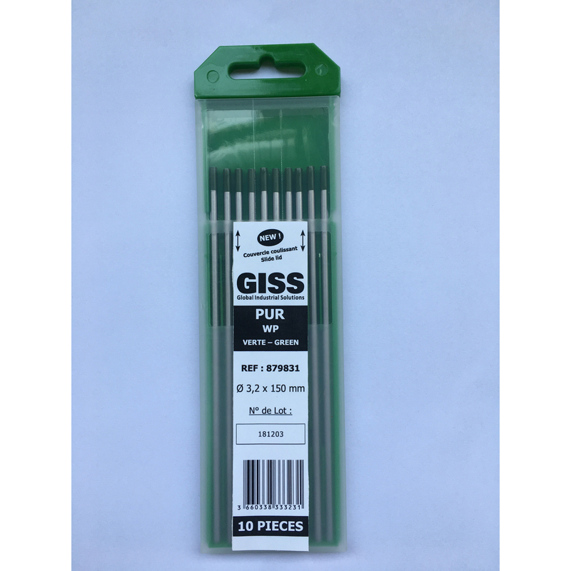 Électrodes tungstène pur WP20. Longueur 150 mm. Etui de 10 électrodes.