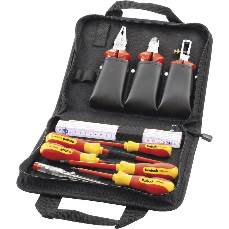 Composition : Outils isolés 1000V contrôlés VDE : Tournevis isolés 1000V : - 3 tournevis Fente : 3x100, 4x100, 5,5x125 mm (réfs 827106, 827107, 827108). - 2 tournevis Phillips PH1, PH2 (réfs 826505, 826506). - 1 pince universelle isolée 1000V-180 mm (réf 840510). - 1 pince coupante diagonale isolée 1000V-160 mm ( réf 840530). - 1 pince à dénuder isolée 1000V-160 mm (réf 840528). Outils non isolés : - 1 mètre pliant (réf 867691) - 1 tournevis détecteur de tension (réf 826498).