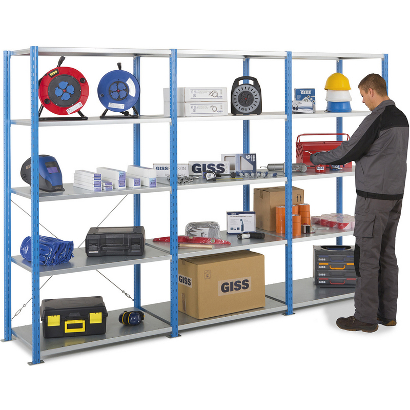 De stijlen zijn voorzien van gegalvaniseerde metalen platen, met gaten om de 25 mm voor het plaatsen van plaatstalen legborden. Afwerking van de stalen stijlen blauw RAL 5015; legborden zijn afgewerkt met gegalvaniseerd staal. Maximale belasting per element van 2500 kg Toepassingen Industrieel rek voor de handmatige opslag van halfzware lasten. Ideale oplossing voor onderhoudswerkplaatsen, werkstations, winkels, magazijnen...